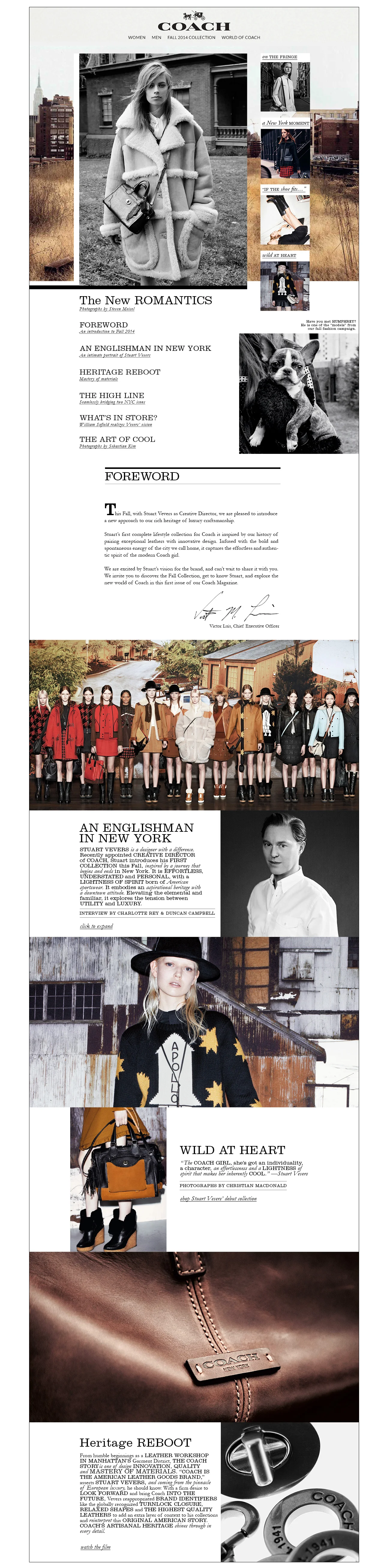 With a new vision for the brand, a print magazine was developed as a way for fans to discover the inspiration behind Coach's new look. I was tasked with bringing this content to a digital context.