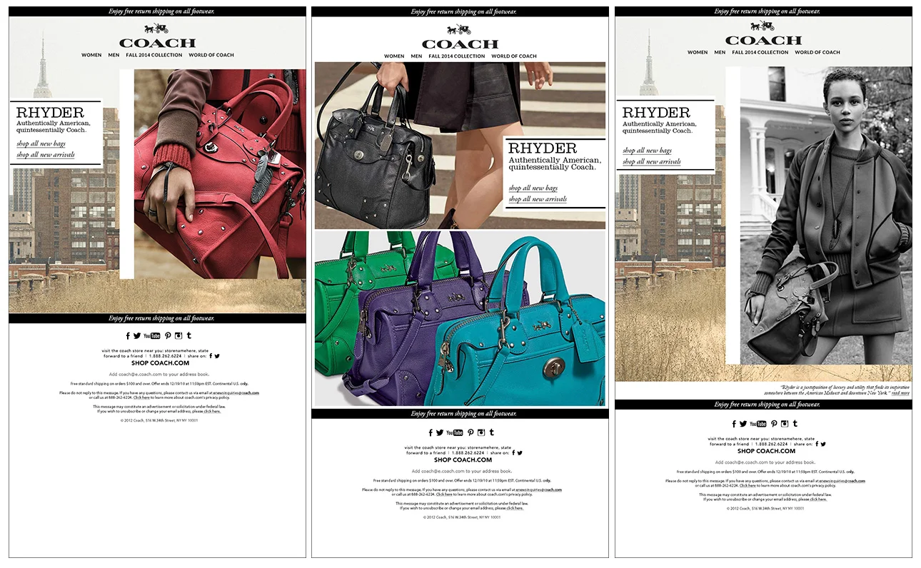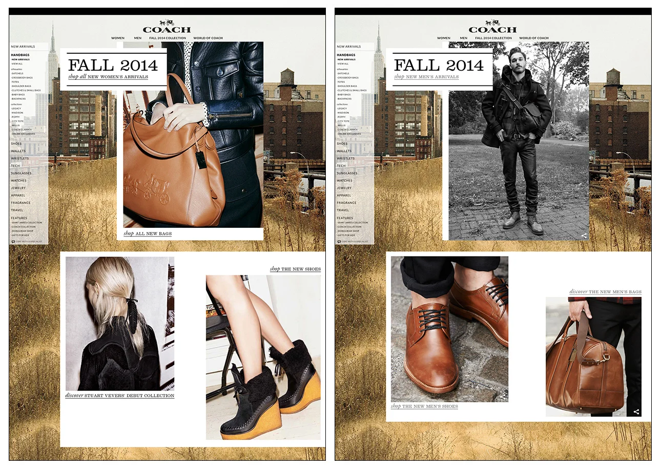 This encompassed all site assets, which included: Homepages, Women's & Men's landing pages, Women's & Men's shop pages, A Digital Version of Coach Magazine, Segmented emails for the month and Social Outreach on multiple platforms.